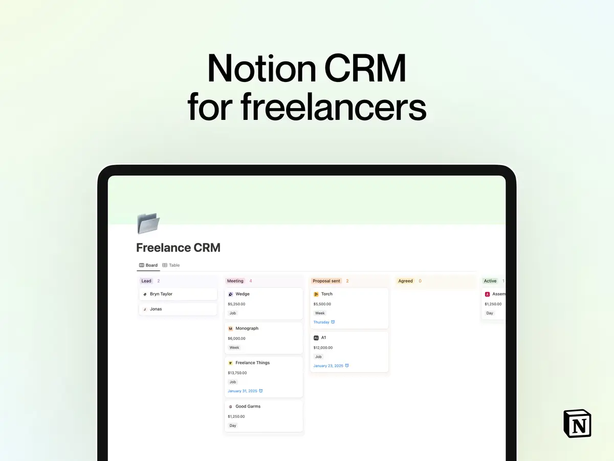 A customisable CRM for freelancers. Track your leads, meetings, proposals sent and more. Easy to customise and built from scratch in Notion.
